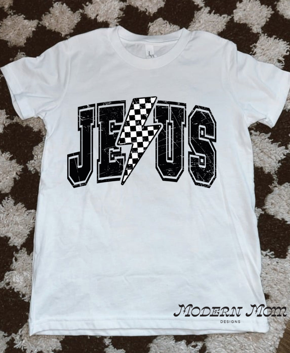 Jesus checkered bolt white (2T-youth XL)-tee, crewneck, or hoodie